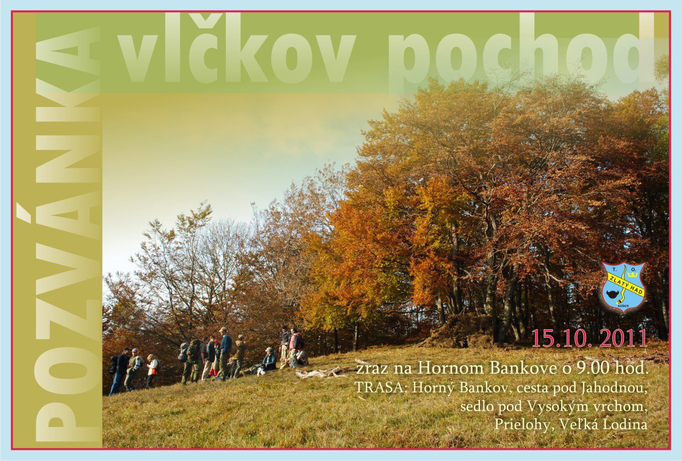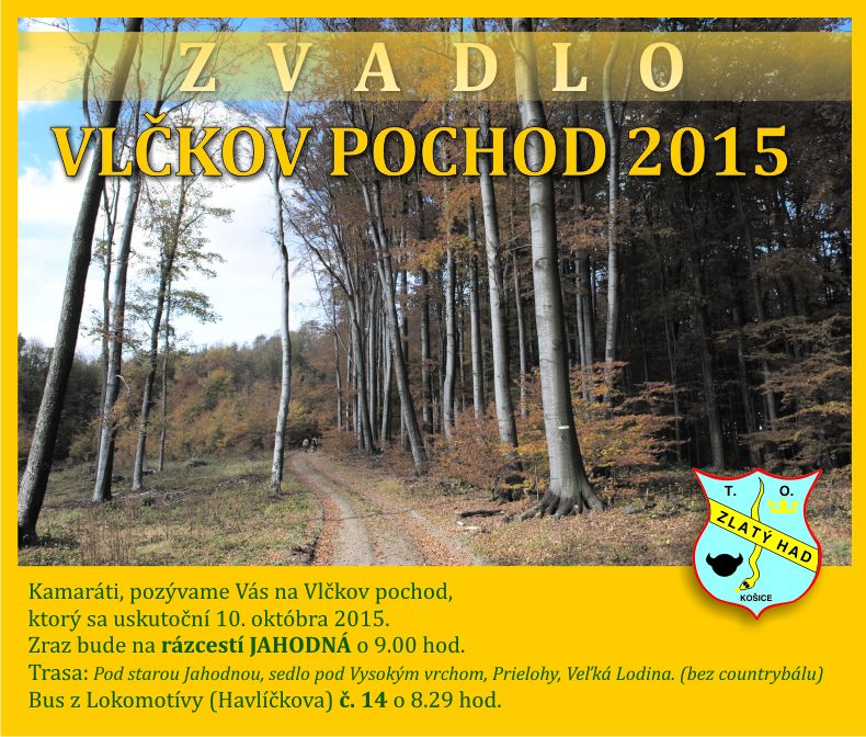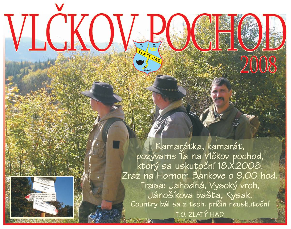01.10.2010: Ahoj kamarátka - kamarát, pozývame Vás a Vašich kamarátov na Vlčkov pochod, ktorý sa uskutoční 16. októbra 2010. Bližšie info nájdeš v pozvánke. Na Vás všetkých sa teší T.O. Zlatý Had z Košíc